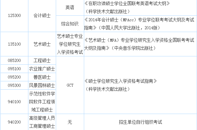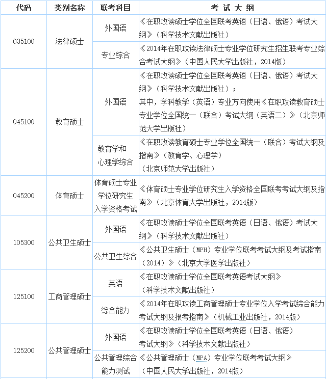 據(jù)北京大學(xué)在職研究生招生信息網(wǎng)老師預(yù)測,2015年十月在職聯(lián)考的考試大綱應(yīng)該還會繼續(xù)沿用2014年的大綱,下面是相關(guān)老師整理的2014年在職聯(lián)考各專業(yè)學(xué)位類別、代碼及考試大綱,以供大家查詢。